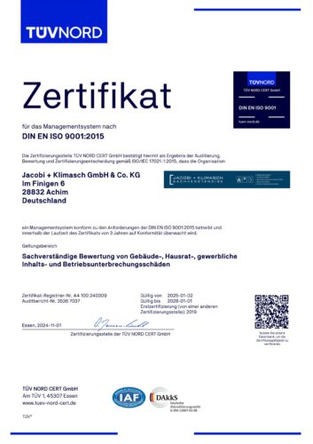 Die Grundlage der von der Jacobi + Klimasch GmbH & Co. KG ausgeführten Tätigkeiten ist bestimmt durch ein dynamisches Qualitätsmanagementsystem, dessen ausführliche Beschreibung in unserem Qualitätsmanagementhandbuch festgeschrieben ist. Unsere Sachverständigen beurteilen nach bestem Wissen und Gewissen unparteiisch. Bei der Organisation der Arbeitsabläufe orientieren wir uns konsequent an den Bedürfnissen unserer Auftraggeber unter Beibehaltung einer möglichst einheitlichen Struktur.
